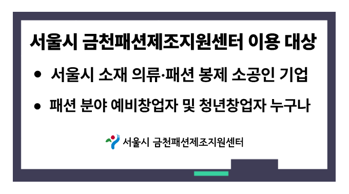 시제품, 자동재단, 미싱장비, 종합 스튜디오실, 1인 미디어실,컨벤션룸, 전시/판매 등 원스탑 통합 솔루션 지원